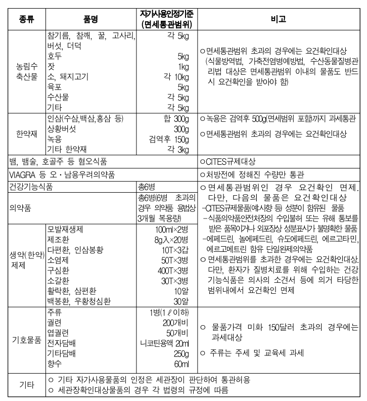 품목별로 자가 사용 여부를 판단 하는 기준은 아래와 같으니 직구 구매시 참고하시기 바랍니다.