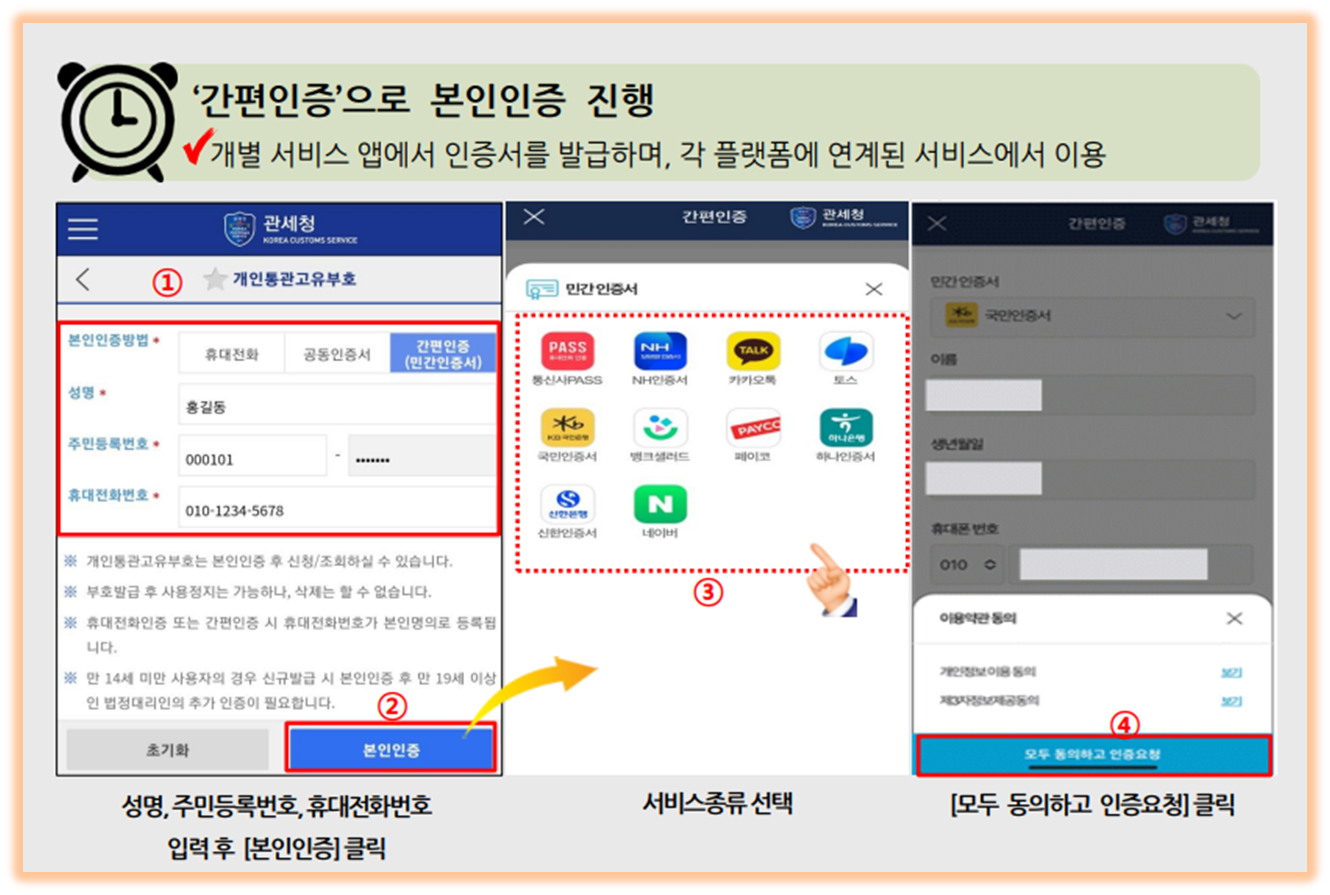 - 대한민국 관세청에서는 해외의 주민번호등이 유출되는 등 개인정보 유출을 방지하기 위해, 해외 직구시 활용가능한 개인통관고유부호 제도를 운영하고 있습니다.