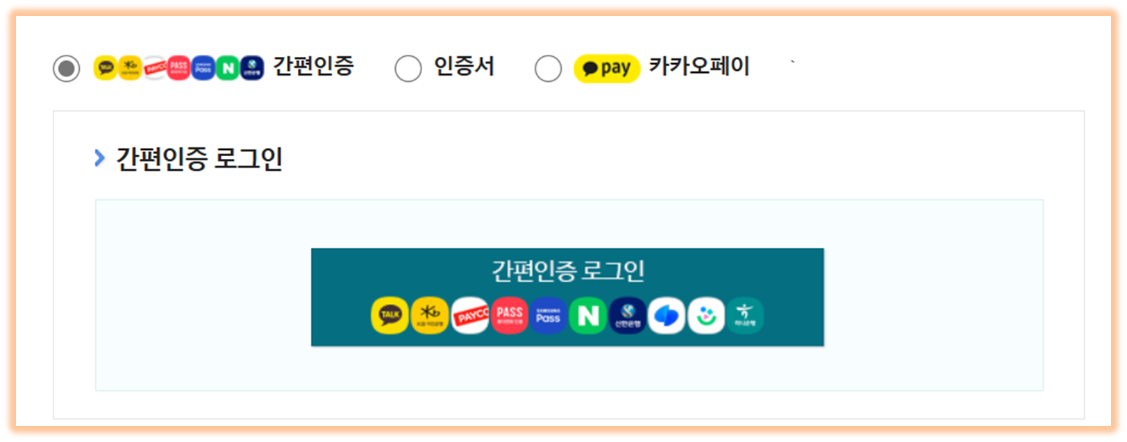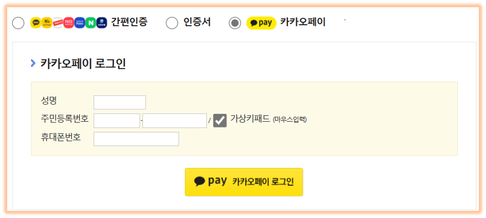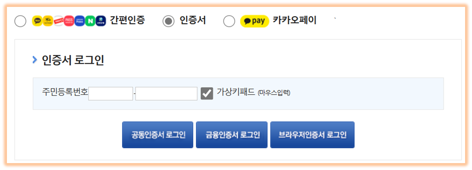 - 본인 인증은 간편인증, 공동/금융 인증서, 카카오페이 인증 등 3개중 하나를 선택하여 인증합니다.