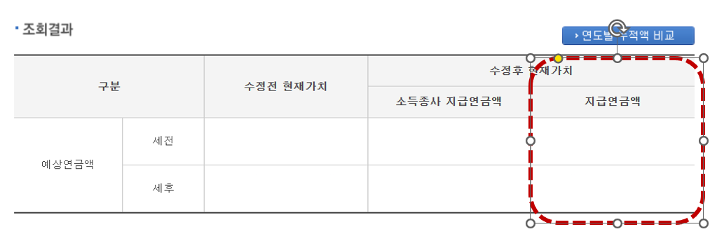 - 조회결과는 다음과 같이 나오며 수정후 조정가치 세후 금액이 조기노령연금으로 수취할 금액입니다.