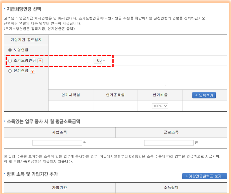 - 조기노령연금을 확인하시기 위해서는 아래의 그림처럼 조기노령연금 수급예상 나이를 입력합니다.