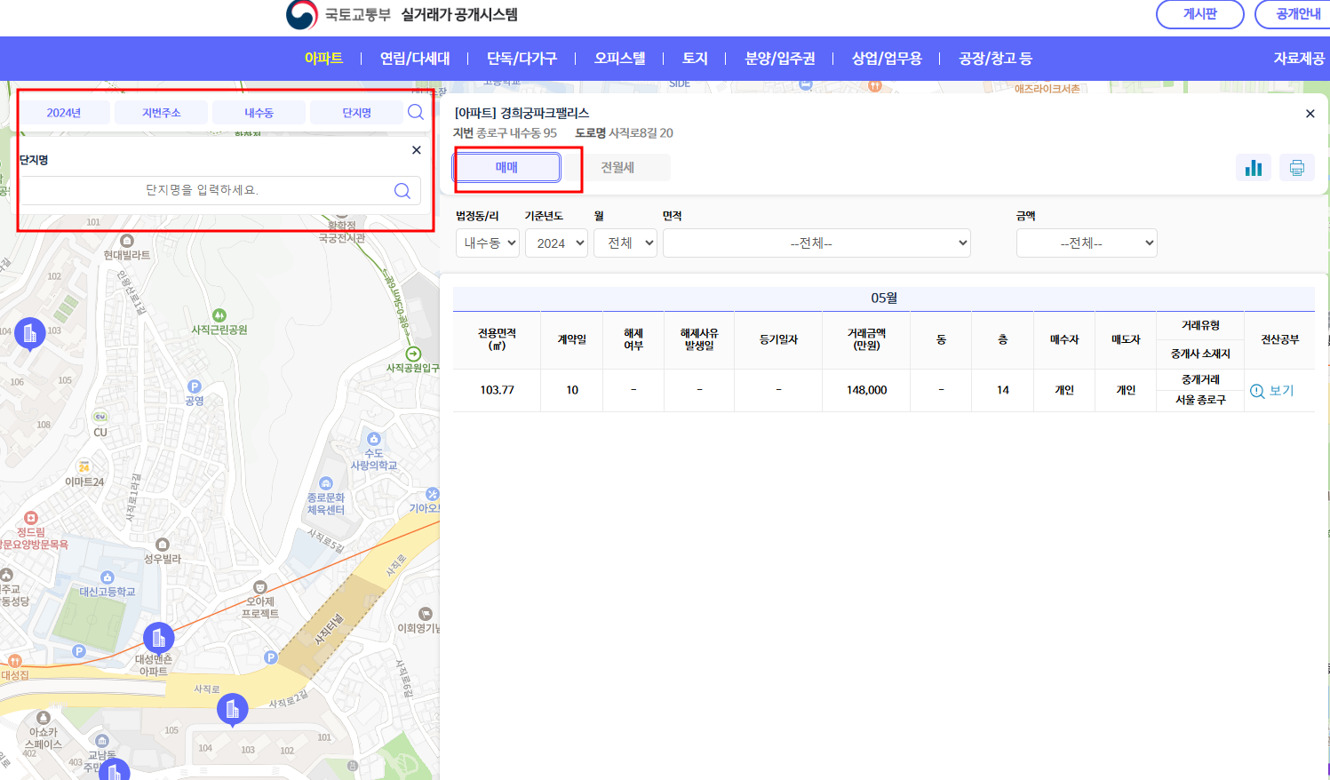 왼쪽에 조회하고 싶은 거래한 년도, 주소, 단지명을 입력하면 볼수 있어요.