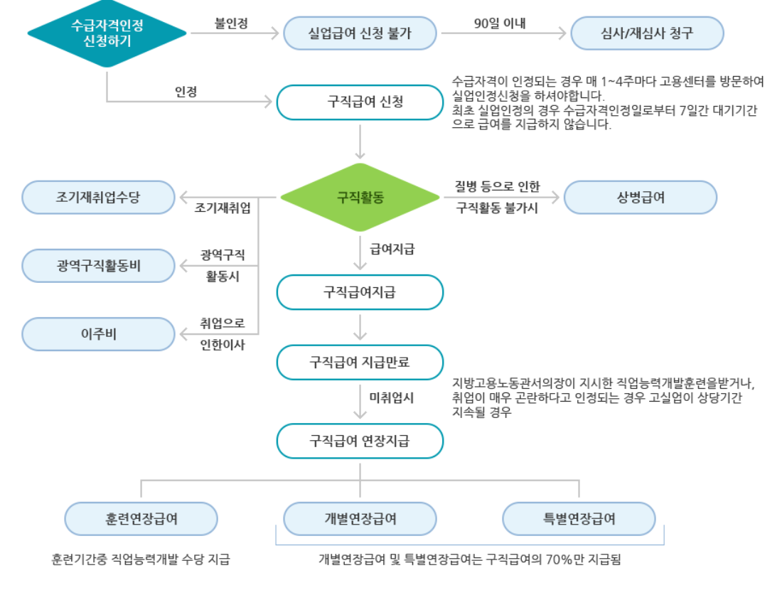 - 구직급여 : 일정 조건에 따른 퇴사자가 근로 의사 및 능력이 있고, 적극적인 취업활동을 하는 경우 지원하는 급여