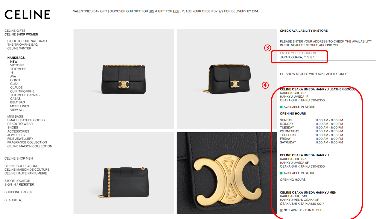 셀린느 공식홈페이지에서는 이러한 불편함을 줄이고자 가격 정보와 현지 매장의 재고조회를 할 수 있게 정보 제공을 하고 있습니다.