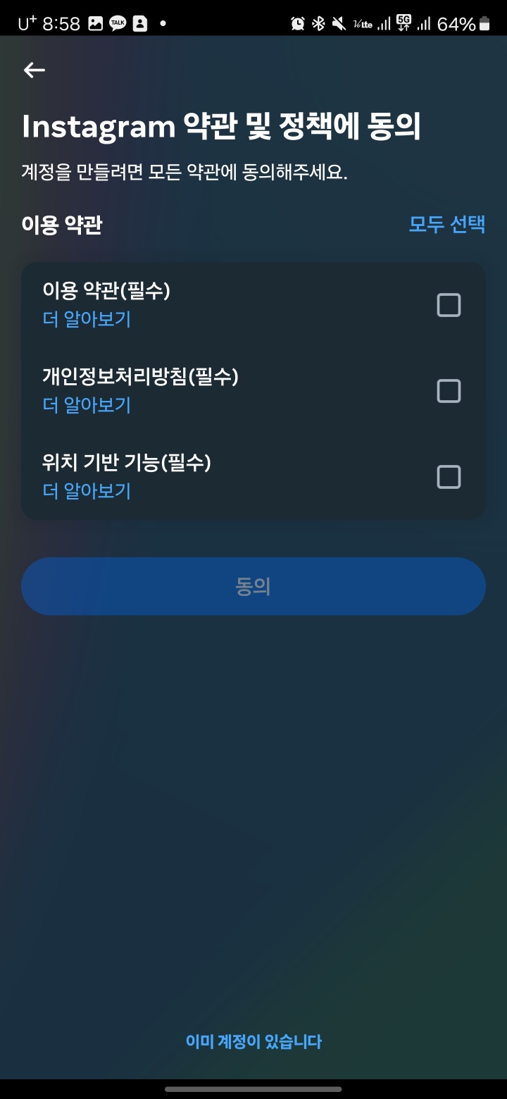 9.인스타그램 약관 및 정책에 동의하면 모든게 끝납니다.