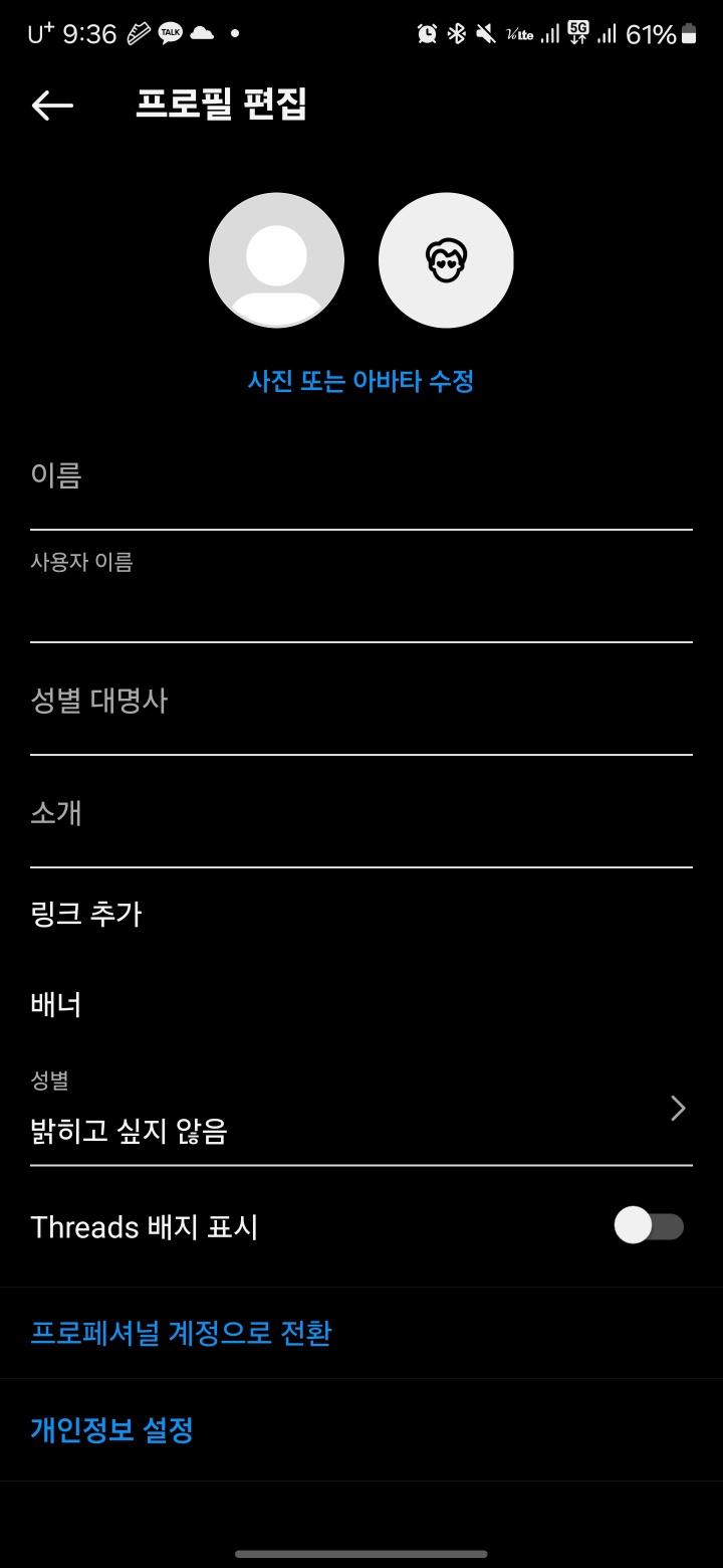 사용자 이름 위 동그란 사람모양을 선택하면, 프로필 편집을 할 수 있게 되어 있습니다.