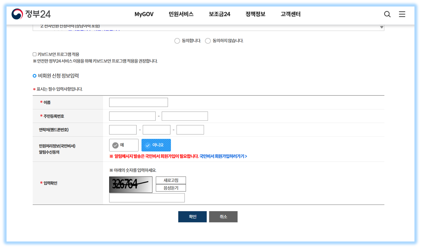 - 비회원 신청하기 누르면 개인정보 수집 동의를 하시고 이름, 주민번호, 입력확인 인증 번호를 입력하고 확인을 누릅니다.